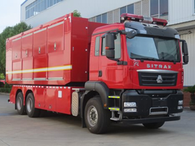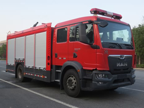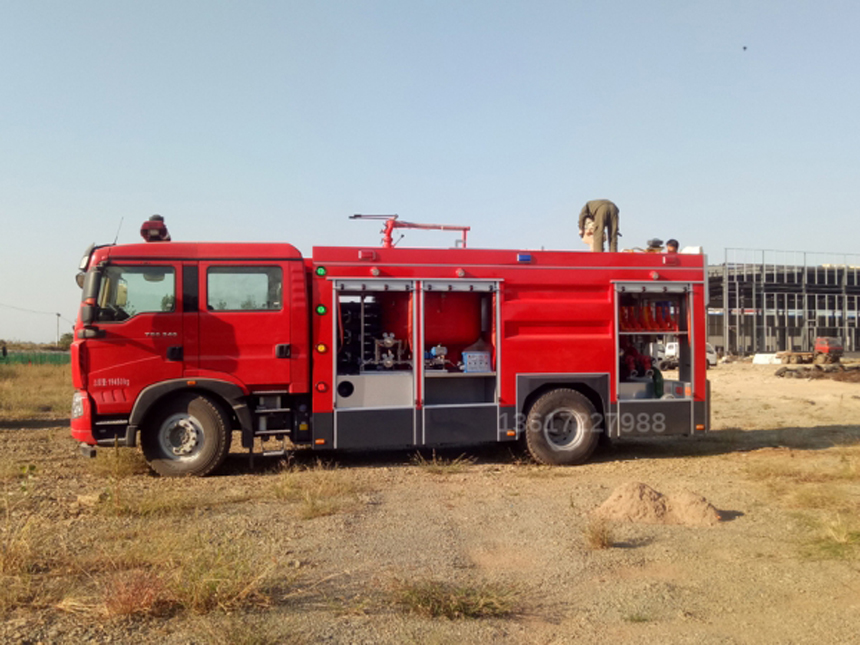 豪沃7噸干粉泡沫聯用消防車采用重汽豪沃ZZ5207TXFV471GF5底盤改裝而成。整車由消防員乘員室和車身兩大部分組成,乘員室為原裝雙排,可乘坐2+4人,該車為外露罐結構,車身前部為器材箱(干粉罐,氮氣瓶,干粉系統),中部為水罐,后部為泵房。載液罐體為優質碳鋼,內部噴涂環氧底漆及環氧瀝青漆,與底盤采用彈性連接,載水量2700kg,泡沫液量2050kg,干粉罐容積2.0立方米,裝備了上海茸申消防設備有限公司CB20.10/30.60-RS型中低壓消防泵,額定流量60L/S,車頂安裝成都威斯特消防機械有限公司生產的PL8/48型車用消防炮和PF5~15/30干粉炮。該車最大的特點是載液量大、操控性好、維修簡便??蓮V泛應用于公安消防隊、廠礦企業及社區、碼頭等場所,撲救大型油類火災和一般物質火災。